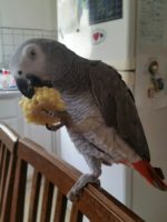 Speaks and knows basic training zero is his favorite. Large vocabulary, red tail is mixed with bright red and non bright red feather’s