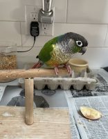 Rio is fully flighted. He is a small green cheek, yellow sided, 4 year old conure with a dark head. At home he is very friendly, affectionate and outgoing. He may actually land on someone if he becomes desperate which i’m so hoping happens. He responds to his name.