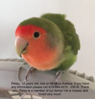 Petey is about 12 years old. He is very tame and loves people. His wings are not clipped. He usually comes when whistled at or chirped at. If found please call 619-994-4275.