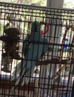 Blue with black ring around neck red beak. Talks. His name is Beaufort. He got out of his cage. Will come sit on your shoulder especially when thirsty or hungry