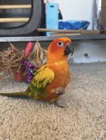 Orange-red head, Orange-yellow-green body. Loudly chirping. Male. Has a leg band of dark gold. Please Help find our baby bird.
