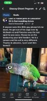 His name is zazu. He will say his name. He has a leg band on his left leg. His colors are darker than most. I have been heart broken for 6 months trying to find my little guy. I miss him and I want him home!!!!