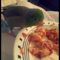 His name is Walter. He is very sociable and will likely fly to anybody. He has blue under his wings and around his eyes, his primary color is bright green. He does have a band around his leg.