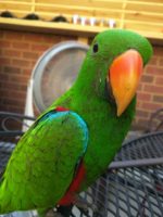 Solomon is nearly 2 years old. He does talk but probably won’t say anything if scared. Red under wings.