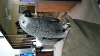 She is grey with a red tail and she has some fethers plucked under her neck if u happan to spot her she loves hod dogs maybe she will come to u if u give her a little bit of a hot dog