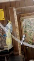 Says his name. Whistles tunes, “Over there”, steps up on your finger, gives kisses. Some toes missing.
