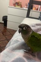 He has a long red tail, his lower belly is somewhat red, his neck is mainly grey and yellow. Has a horizontal line at the bottom of the beak.
