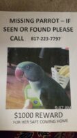 My parrot flew away on 11/05/20 in the evening. She is a Green Alexandrine Parrot with red spots on her wings with a long tail and a red beak. She is friendly and could fly to you/ on your shoulder if you show and give her a treat. Sometimes she like to walk on the ground and hide herself on the corners. She is part of my family and we are missing her so much. If seen or found please call me at 817-223-7797 or email me at mehrshadvafaei@hotmail.com