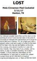 Our beloved cockatiel Jacob flew out the door on Feb 11, 2017 in Denton, TX. He was last seen on Feb. 11, 2017 in the area of Coronado Dr, between the intersections of N Locust St and N Bell Ave. He is young, about 6 months to 1 year old. He is light grey with a greyish yellow crest and a patch of white on the back of his head, and only has one tail feather right now. Very friendly. May chirp back if you whistle, call his name, or play a cockatiel recording. We miss him dearly. 🙁 Please call Ginny at 817-454-8415 or Sean at 940-465-5029 if you have any information or if you have seen or found him.