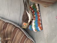 He is a traditional Cockatiel, 3 years old, cheeks are yellow with graying shade over the yellow. He has a weak bite, because he’s gentle! He loves to be pet and eats at the table with the family, food specially prepared for his own diet needs!!!