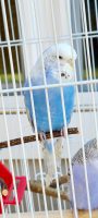 Lily is a budgie (bird), and she is blue in color. Her head is white/grey, and she is about the size of your palm and can easily fit in your hand.
