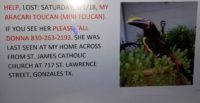 Escaped. She’s a 4 yr old Green Aracari Toucan, female. Tame, curious & sweet natured, and will go to anyone. She has a band