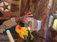 Flew off husband’s finger this morning! Between Hico and Iredell, Texas near the Bosque River Bridge Highway 6 and County Road 2480. Very Beautiful Bird! Very vivid colors. Loves music