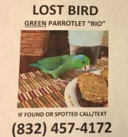 Rio flew out of my parents house on Oct. 25! Please call me at (832) 457-4172 if you have any leads or know where he is! I am so worried about him and am heartbroken about this:( he was lost in the cinco ranch area in Katy, TX. He is a green male parrotlet with blue by his eyes and wings. Thank you for your time 🙁