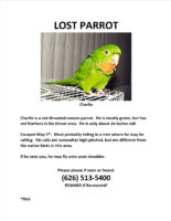 Charlie escaped on May 5, 2017 at the Carson Street and San Gabriel River intersection (Lakewood/Long Beach, CA). He is a red-throated conure. He is mostly green, but has red feathers in his throat area. Stands about 6″ tall. Two credible sightings were made on May 18, so he may still be out there. Please be on the lookout and please spread the word if you can. Thanks, *Rick