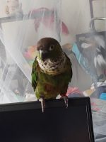 Orange band on leg, some red spots on his belly. Hes kinda fiesty but he really loves food.