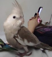 Description: small two-year-old cockatiel, the edge of its wings is white