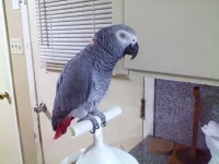 Bodie is a 13 year old Congo African Grey, she has red feather on the back of her neck, her wings are no clipped. She is not good at flying. Bodie mimics sounds like the fire alarm, microwave sounds, cats, dogs barking,running water sound, whisles “la cucaracha” and her own songs. Some words on her vocabulary are : Bodie!, Bodie bird, I want some water, water, tickle tickle , Angel, Dexter, Hello, No, wooo! , what?! and more. Bodie has a Spanish accent when she talks. She eats a seed/pellet/mix , fruits and some veggies.