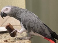 Bird parrot African grey with red tail, gray and white body and black beak.