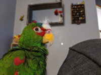 Description: My name is Fry, I am a six year old White-Fronted Amazon. I like to whistle when tired, talk when bored, and chatter when