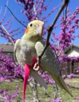 Yellow/Cinnamon Pearl. Her longer flight wings are still growing out, 2 on each side. The right are pale yellow and the left are gray. She flies well.