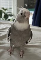 He is a grey and white cockatiel who sings “if you’re happy and you know it” and the Addams family theme song. Extremely social and responds to his name. Has never been outside until now so may be scared of being approached.
