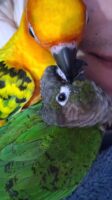 His name is kiwi. He’s 6 month old, green cheek conure. Doesn’t have a band on his leg. He makes sounds like kissing. He’s not too friendly with strangers. We live near the Sherwood Hall Library, in Alexandria. If somebody has seen him, please, call us to 5713291778 or 5712757607. We’ll appreciate your help. We cannot offer q big reward but we’ll give you some compensation for the help.