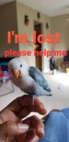 He is friendly and tamed, he respond to his name, he is blue and white.
