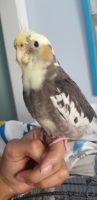 She is only 6 months old with grey and yellow all over her. She has little gray markings on her face, most noticeably a splotch that looks like a little eyebrow on her face. She had a little bit of white on her wings. She sometimes responds to high pitched whistles (around 70 percent of the time you whistle for her) and she likes tall people, specifically men. She also really likes millet. If you find her, she is a bit skittish