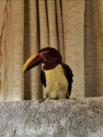 Emerald back, yellow belly, yellow and red bill that measures 4 inches in length, softball sized, makes short staccato vocalizations but can get shrill when she is hungry or wants attention. $1000 reward if found alive.