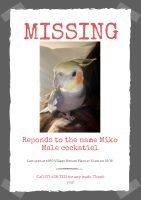 Miko escaped this morning at 10 AM. He is a 4 years old Cockatiel who can speak and make sounds. He likes to follow peoples feet and can say his name. If seen, please call out his name and find a way to contact the animal shelter or my number.