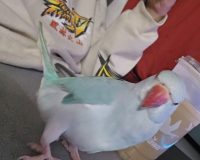 Pookie is a light blue/teal colored bird and responds well to words like hop up, Thank you baby and treat treat. Also saying pookie her name she tends to call back. She was born with a bad right leg