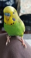 Male yellow-green pied budgie, can mimic water sound, tounge flicks, “spring”(my other bird’s name), “wewewe” sound.