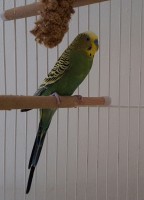 3 years old green budgie, has a little yellow feather on the back of it’s head as a mark among green feathers.