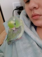 A little bit skittish, approach non-confrontational. Will pretend to bite but usually does not. Does not know how to fly downwards (last time checked). Will land on heads or shoulders. Hard boiled eggs is her favorite. Usually does not like grabbing on to bare skin, wrap a towel or cloth over hand.