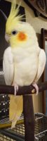 Bald spot on top of head, extremely attached to owner. Yellow with “rosy” cheeks.