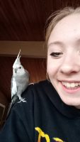 Named Darwin, loves millet and broccoli. Makes kissing sounds and plays peek-a-boo. Has slightly clipped sings, love to ride on shoulders.