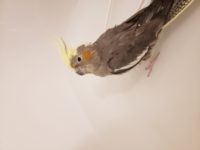 Greyme is a grey cockatiel with white on her wings and a yellow crest. She somehow got her metal leg band off a year ago. She is not clipped and is cautious around humans but feels safe landing on people’s heads. Greyme comes from a loving home and her partner misses her very much!!!!