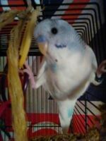 Looks like a cloudy sky colouration. On the smaller side in size, has one black ‘beauty mark’ on one side of face. Male with obvious blue cere. Isn’t completely hand trained yet.