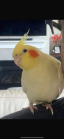 Lutino (light yellow cockatiel). 6 months old male. Green band on left leg. Likes mobile phones and screens. Hand fed and tamed, not afraid of human.