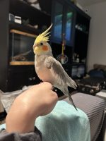 Make cockatiel named Wedge. Light gray body, yellow head with orange cheek patches. Usually responds to his name, wolf whistles, and whistling the Star Wars imperial march. Very friendly. Has yellow/white patches on the back of his head.