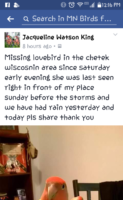 Rosie hasnt been seen since june 25th.. In chetek wisconsin….she is so missed by her baby brother… Rosie has peach/ yellow tint on her entire head and chest…she will give kisses as well as bite. She is only 16 mths old