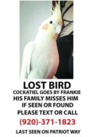 Lost bird. Cockatiel. Goes by “Frankie”. If family misses him. If seen or found, please text or call 920-371-1823.
