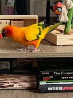Juniper is a small sun conure parrot. She is about the size of a Robin. She is mostly yellow and orange with green and blue on her wingtips. If you see her you will know she is not a local wild bird. She may try to perch on your head or shoulder. Lost in North Taylor/Schanock area. Please contact me if you see her!