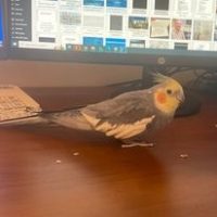 Sam is gray with white on wings and yellow head. He also has a small white spot on back, just below head on right side, (see pic). He responds to and says, “peekaboo” and can also say “hi”. Whistles patterns and “Lacucaracha”.