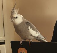 Very friendly, grey and white cockatiel., likes to whistle the Aria of the Queen of the Night by Mozart. No leg bands.