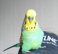 Blue-green body, yellow head. Extremely friendly. Says his name “Chewy.”