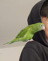 All green Canary winged parakeet lost on May 3rd 2025. She is very nice, sweet and friendly. She is probably scared. She has been missing for a full 5 days now. Please please please help me find her. She whistles, and loves oranges and pineapples.She has a blue band on right foot. Yellow feather peaking through on each wing. About 9 inches long from beak to tip of tail.