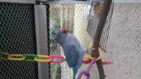 Cody is a beautiful violet blue Indian ringneck, he has a long tail and a red beak. He makes Quaker screeching sounds. He may respond to Cody and peekaboo.