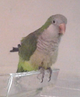 Charlie looks like a typical green Quaker parrot, with bright green feathers, lighter on the bust and beautiful dark blue tail feathers underneath. He LOVES Fritos and gets excited anytime he hears that type of bag crinkle, so would be likely to investigate.